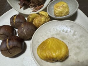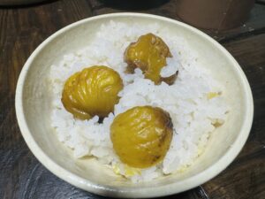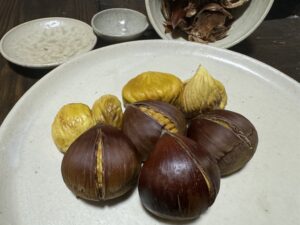 切れ目を入れて、オーブンで7分加熱するとポロリ。 ぽろたんは氷温近くで3週間熟成させると糖度が跳ね上がる特性があります。 甘くてホクホクの栗ご飯ができました。 ちなみにお皿と茶碗は、近所の陶芸家さんが栗の枝を燃やした灰で作った釉薬で 焼いてくれました。枝は陶芸に、イガと葉は堆肥にして還元されます。